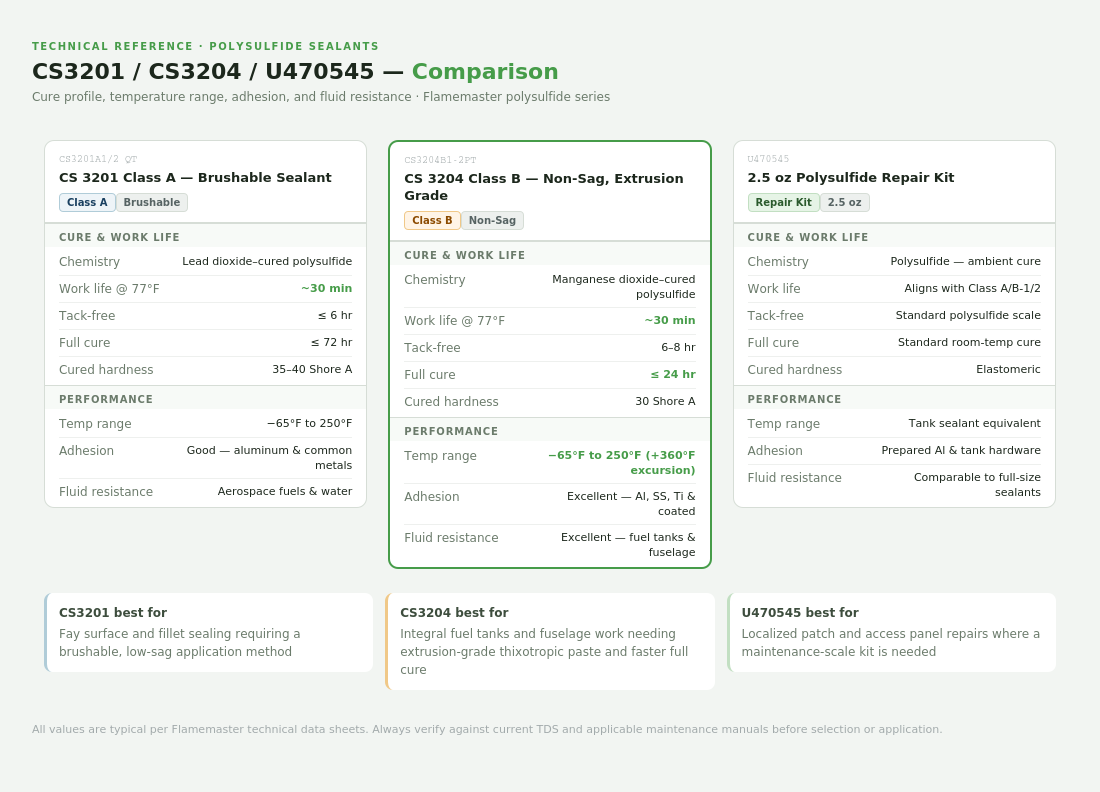 ChemSeal CS3201 Class A and CS3204 Class B sealants are direct continuations of established polysulfide chemistries dating back to legacy sealants like the ProSeal product families, which have been used for decades. These maintain compatibility with existing aerospace primers, adhesion promoters, corrosion inhibitors, and repair practices, and align with the performance standards of AMS-S-7124 and AMS-S-8802.